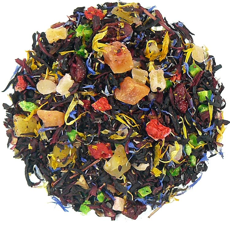 Składniki: hibiskus, mango kandyzowane, papaja, ananas, żurawina, cytryna zielona kandyzowana, melon kandyzowany, truskawka liofilizowana, bławatek, nagietek, aromat.